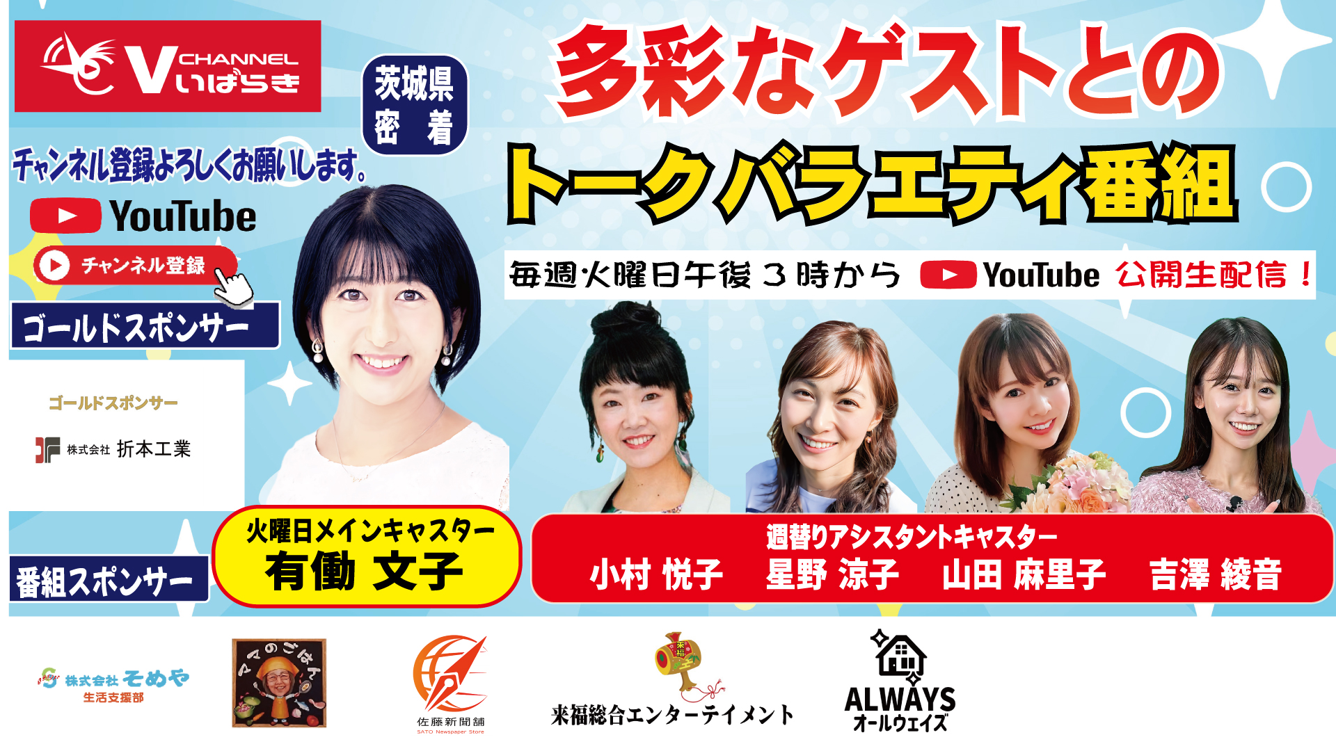 TOP Vチャンネルいばらきは、「茨城県内で活躍されているゲストをお迎えして、ひと、こと、モノをテーマとしたトークバラエティ番組です。」異業種間企業の「繋がり」と「絆」を大切に 【番組一覧】 Vチャンネルいばらき(毎週火曜15時~生放送) 【イベント配信(アーカイブ)】 【金曜3時のマイジェネ(アーカイブ)】 【Ⅴチャンネルスポーツ】 ゴールドスポンサー 株式会社 折本工業 【番組スポンサー】